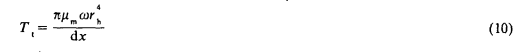 文献认为流体在两个叶片之间流动时,轴承外表面上的作用力与轴平行。实际上,流体是以一定角度通过叶片的,所产生的阻力矩不能忽略。采用与式(3)类似的动量方程,轴表面上的速度取x的四次幂分布(W=Cx4),可以得出Ta的表达式为