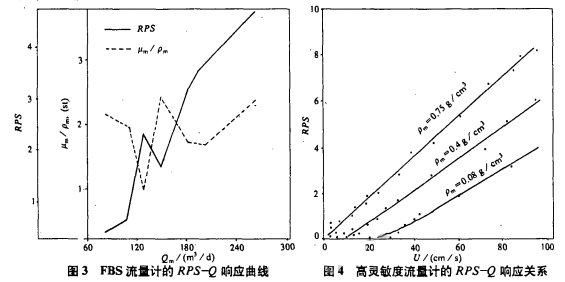 多相流动中,U和μm/ρm随温度、压力、油气水的含量的变化而变化。图3是利用斯伦贝谢的FBS流量计由实验作出的RPS-Q响应曲线,从图中可见,随μm/ρm的突变,RPS值也发生了响应的剧烈变化。