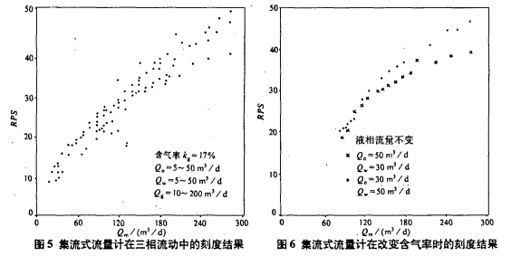 图5是对斯伦贝谢公司的集流式流量计进行刻度的结果。实验所用油、水的密度分别为0.825g/cm³和1g/cm³,用空气模拟天然气,油、水、气的流量变化范围,考虑了常见油气水产量和含量的变化。从图中可见,实验数据的线性关系良好。图6是液相流量不变,含气率在10%~70%间变化时的刻度结果。在总流量(Qm)变化范围为80~300m³/d时,油水比的变化对RPS-Q响应影响不明显。因此,多相流动中确定总流量的可靠方法是采用集流式流量计。