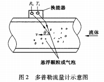 多普勒法是利用声学多普勒原理确定流体速度。多普勒原理是若声源和目标之间有相对运动,会引起声波在频率上的变化,频率变化正比于运动的目标和静止的换能器之间的相对速度。图2是超声多普勒流量计示意图。发射晶体T1发射的超声波遇到流体中运动的颗粒或气泡反射回来由接收晶体R1接收,发射信号与接收信号的多普勒频率偏移与流体速度成正比。忽略管壁影响,假设流体没有速度梯度且粒子是均匀分布的,可得: