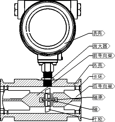 图所示为涡轮流量传感器结构简图,由图可见,当被测流体流过传感器时,在流体作用下,叶轮受力旋转,其转速与管道平均流速成正比,叶轮的转动周期地改变磁电转换器的磁阻值。检测线圈中的磁通随之发生周期性变化,产生周期性的感应电势,即电脉冲信号,经放大器放大后,送至显示仪表显示。