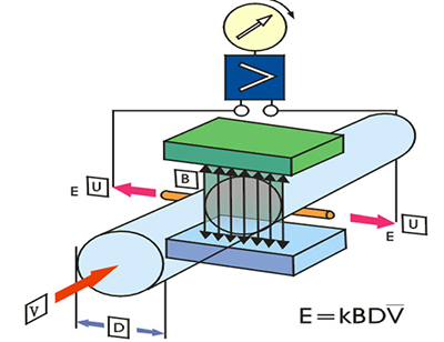 当导电液体沿测量管在交变磁场与磁力线成垂直方向运动时,导电液体切割磁力线产生感应电势。在与测量管轴线和磁力线相互垂直的管壁上安装了一对检测电*,将这个感应电势检出。