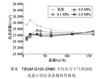 (1)根据式(6)计算出的在不同工作压力下流量计仪表系数的重复性,说明涡轮流量计仪表系数受压力变化的敏感性较小。TBQM-G65-DN50在4种不同压力下流量计仪表系数变化的重复性仅为0.502%,而TBQM-G100-DN80的重复性仅为0.282%。