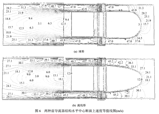 图6为与图5相同位置上的速度等值线分布。在前导流器处,可看出对应压力变化剧烈的区域,速度变化也较大。球形头部速度急剧增大、直管段速度几乎不变的分布趋势使其中心出口速度(47.0m/s)较大(流线形45.2m/s),在同流量下表明球形前导流器具有较大速度梯度。当气流进入尾流部分后,由于流道突扩,在支架的背面形成明显的低速涡区,之后管壁附近速度降低,中心区主流速度回升,速度值被逐渐拉平,对应压力也逐步回升。可看到,至出口断面,流线形的速度不均匀*大差值为6.0m/s,球形为9.4m/s,即球形的出口速度梯度更大,压力回升则相应较慢。