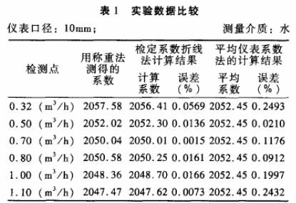 被检仪表:公称通径分别为10mm和15mm的涡轮流量传感器各一台;检定装置:静态称重法标准水流量检定装置,系统精度+0.2%。分别采用常规的平均仪表系数法和检定系数折线法进行标.定,并与作为标准的静态称重法的检定结果进行比对,结果见表1.表2。