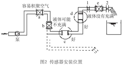 液体流动方向必须与传感器壳体上箭头方向一致。对于能正反向测量的冷冻水回桃色成人在线视频,若方向不一致虽仍可测量,但设定的显示流动正反方向不符,必须改正之。若拆传感器工作量大,也可改变传感器上箭头方向和重新设定显示仪表符号。管道未充满液体主要是管网工程设计或传感器安装位置不妥,使传感器测量管内不能充满液体。应采取措施,避免安装如图2所示a,e位置和以虚线管排放时b位置,改装到c,d位置。