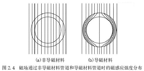 1.测量管:主要是传感器的管道,该管道由高导电率非导磁材料制成,可保证流体在通过时能够表现出自身的电磁效应,在该管道内中安装了内衬。使用非导磁材料的原因是保证励磁线圈中所产生的磁场不会顺着管道流走,确保测量管道内部产生明显的磁感应线,下图 2.4 中展示了利用非导磁材料和导磁材料管道中所产生磁感应线的情况。