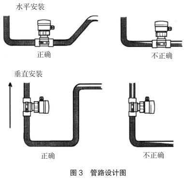 现场安装时应注意远离可能对其产生干扰的大型设备,防止长期的热辐射和其他如磁场直射等环境影响。为确保高测量精度和较好的零点稳定性,进行校正前,燃油流量表应装入工艺介质中至少 24 小时电*钝化。安装的管路设计应确保管道始终充满流体,防止测量误差,管路设计图见图 3。