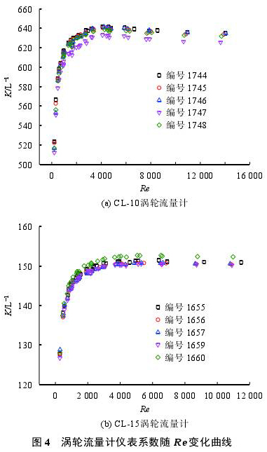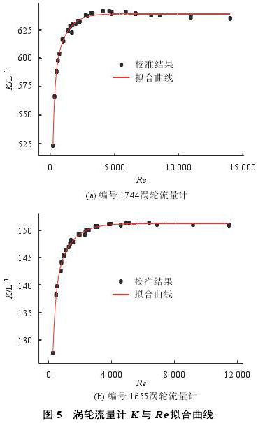 利用双指数衰减函数对仪表系数与雷诺数关系进行拟合,在层流范围内(Re<2300),仪表系数随Re增加迅速增加,尤其是在Re<1000范围内更加明显;而在Re>3000紊流范围内,仪表系数变化平缓,接近常数;在10003000的稳定仪表系数。