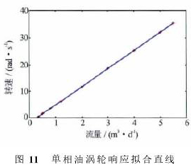 采用同样的方法,对单相油条件下涡轮响应规律进行研究(见图11),测得单相油的启动排量为0.08m3/d。对单相油的实验结果进行拟合,可得单相油的响应曲线为ω=6.73Q-6.72。与水对比而言,油的拟合曲线斜率更大,即随着流量增加转速增加得略快。