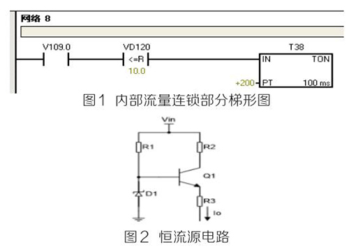 (2)PLC及模块。PLC及模块是自动化控制系统主要设备,且PLC及模块属于高集成高精密电子设备,保持室内整洁舒适,可以提高自动化系统运行稳定性。PLC及模块硬件运行可靠,内部控制程序是其控制核心软件,如PLC硬件出现故障或损坏一般直接更换,但原内部控制软件无法上传,整个控制系统成失控状态。所以其内部控制程序在调试验收合格后应及时备份并做好标记,为以后修复PLC故障提供保障。PLC系统的维护技术人员需掌握一定基础PLC控制逻辑原理,对准确判断PLC故障点有很大的帮助。例如选矿厂水泵房S7-200系列PLC自动抽水系统出现如下故障 :触摸屏能控制变频器启动水泵抽水,但在短时间内会自动停泵,导致无法正常抽水。通过故障现象可初步判断PLC及模块硬件设备正常,主要由于某个变量有问题导致连锁停机。打开备份PLC控制梯形图程序进行相关分析,原来是DN80汽油流量表瞬时流量数值做了连锁,其在一定时间内瞬时流量不大于10m 3 /h时,自动停泵,电磁流量模拟量输出电流值仅为4ma且无变化,确定DN80汽油流量表有故障。可临时应急维修,模拟量模块输入模拟电流值10ma~20ma之间一固定数值即可恢复正常运行。制作简单恒流源电路代替DN80汽油流量表输出的模拟电流量,实现解决水泵无法正常运行的故障。