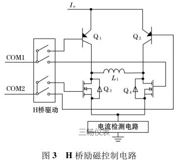 由图 3 可知,I o 为高低压切换恒流控制电路输出的恒流源电流,H 桥驱动的 COM1 端控制三*管 Q 1和场效应管 Q 4 的通断;COM2 端控制三*管 Q 2 和场效应管 Q 3 的通断。L 1 表示的是励磁线圈(传感器中线圈),COM1、COM2 为正交的 PWM 波信号,因此在励磁线圈 L 1 的两端会产生方波励磁信号。检流电路主要是用来检测励磁线圈中电流的变化,当线圈中的励磁电流方向变化时,可以及时将此信息反馈给高低压切换恒流控制电路中的比较器,从而实现切换高低压源达到恒流控制的目的。
