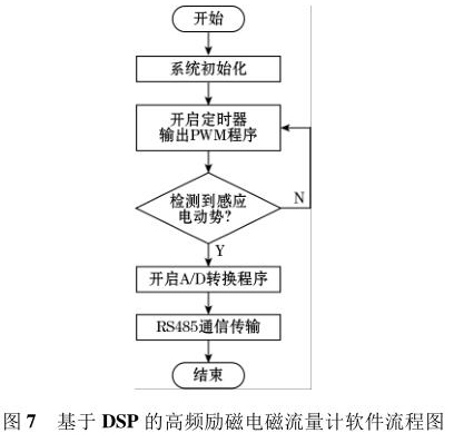 软件流程图如图7 所示。软件采用模块化的设计方法,主要设计了励磁控制切换程序、PWM 波产生程序、A/D 转换程序以及 RS485 通信程序等。系统上电后*先执行复位操作,利用 DSP 内部的定时器产生PWM 波控制 H 桥电路中的励磁方式,当系统检测到传感器线圈输出的感应电动势后,利用 DSP 内部的 12位 A/D 转换器对此信号进行模数转换,*后根据相应算法计算出管道中被测液体的流量。