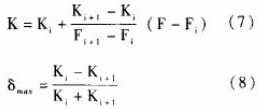 轮流量传感器的仪表系数K与Q的关系近似线性的单调函数(见图2)。因此,在对检定结果进行处理时,直接将各检定点的检定结果以Fi、Ki的形式存入甲苯流量计的数值运算部分,不必对其仪表系数取平均值。在使用涡轮流量传感器进行流量测量时,根据涡轮流量传感器的信号频率F,即可在以上检定结果中检索各F,值,找出满足F,≤F≤F的Fi、Fi+1(i=1,2,.,.n-1),n是该涡轮流量传感器的流量检定点数;若信号频率F=Fi或F=Fi+1,则相应的Ki或K.i+1即为所需的仪表系数;若信号频率Fi