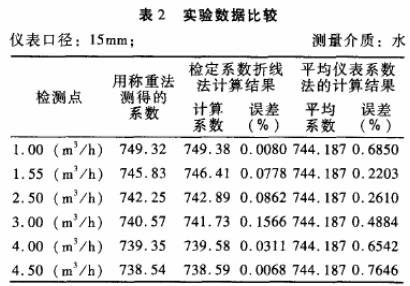 被检仪表:公称通径分别为10mm和15mm的涡轮流量传感器各一台;检定装置:静态称重法标准水流量检定装置,系统精度+0.2%。分别采用常规的平均仪表系数法和检定系数折线法进行标.定,并与作为标准的静态称重法的检定结果进行比对,结果见表1.表2。