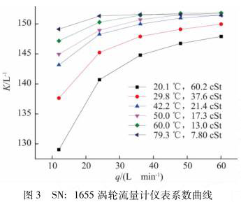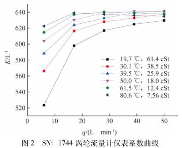 利用航空润滑油流量标准装置在20,30,40,50,60,80℃下分别对4支热水计量表进行校准试验。流量计校准流量点分别为6,17,28,39,50L/min;流量计校准流量点分别为12,24,36,48,60L/min。图2和图3分别是SN:1744和SN:1655两支热水计量表在各温度点仪表系数K随流量q变化曲线,从中可以看出,不同温度点下流量计仪表系数差异很大。