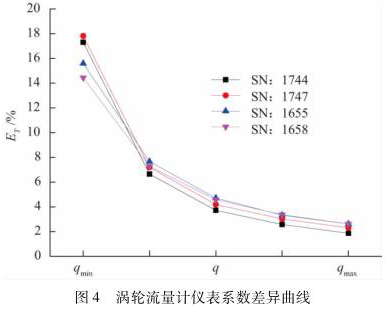 4支流量计各流量点q下仪表系数误差ET曲线如图4所示。