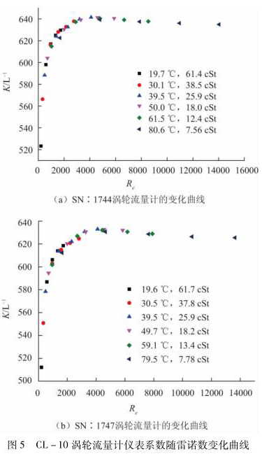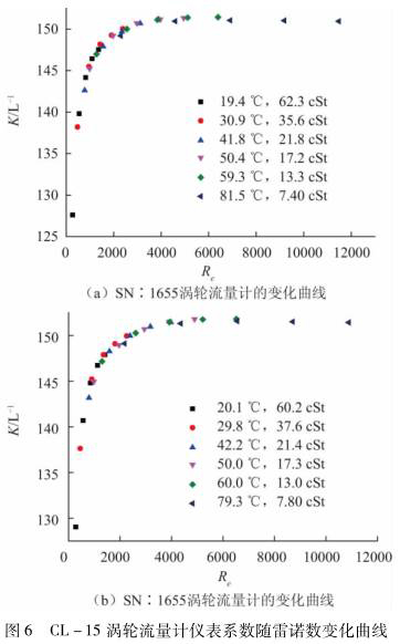 热水计量表不同温度点仪表系数差异很大,主要原因是温度改变导致航空润滑油粘度改变。校准结果中仪表系数随流量变化曲线未体现滑油粘度对热水计量表的影响,流量计仪表系数K随雷诺数的变化曲线如图5和图6所示。同一支流量计在雷诺数相近的情况下,其对应的仪表系数很接近,仪表系数是雷诺数的单值函数。雷诺数Re关系式为