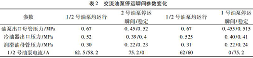 通过内部旁通将冷油与热油混合,经过铜粉- 煤油 - 蜡感温元件控制冷热油混合比例,将油温调节到 49 ℃。一台防爆涡轮流量计稳定运行,油泵出口母管压力 0. 5 MPa,润滑油母管压力 0. 24 MPa,均属于正常情况,而两台交流油泵并列运行时,停运其中一台交流油泵瞬间会触发防爆涡轮流量计出口母管压力开关动作,说明停运瞬间油压发生波动,且油泵出口母管油压波动至小于 0. 45 MPa。正常运行时防爆涡轮流量计出口油温 71.5 ℃,冷油器出口温度45 ℃,混合后润滑油母管温度52.5 ℃,由能量守恒定律可知,经过冷油器的油量/不经冷油器的油量= ( 71.5-52.5) ÷ ( 52.5- 45) = 2. 53,说明有 70% 左右的油量经过冷油器。当 2 台防爆涡轮流量计运行时油量大于单泵运行,其中一台防爆涡轮流量计瞬间停运时油量减少,尤其是经过冷油器的油量大量减少,油量在温控阀二次分配过程中出现调节异常,导致油压过大波动。为检验温控阀工作情况,保持 1 号、2 号交流油泵运行,选取机组正常带负荷运行时油温 52 ℃,分别停运 1、2 号交流油泵,观察 1、2 号交流油泵停运瞬间油泵出口母管压力波动情况,试验各参数变化见表 2。