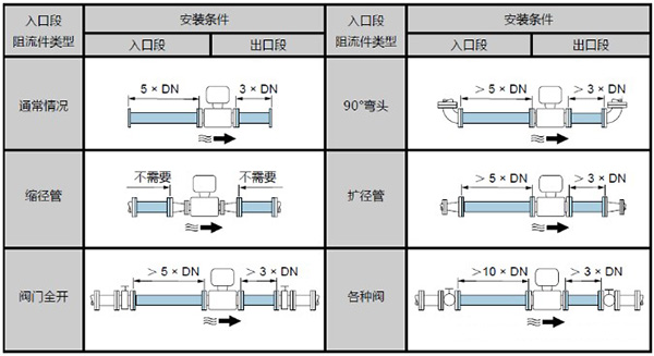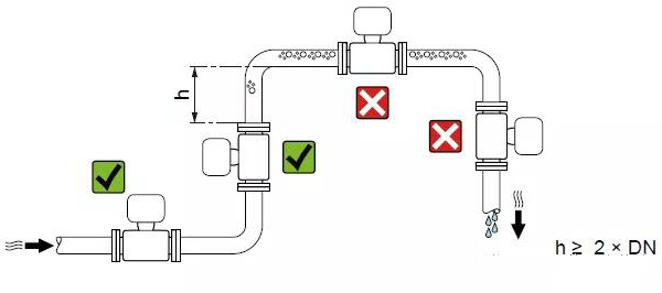 管路必须完全充满液体。保证管路始终充满液体至关重要,否则流量显示会受到影响,而且还会出现测量错误。管路结构的设计必须要保证测流管始终充满流体。当流体有分流或含有固体颗粒沉淀物时,建议使用垂直安装。但采用垂直安装时,要遵循流体从下到上的走向,以保证管路充满流体。