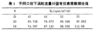 (2)可见,对确定的涡轮流量传感器,易知口径D大,K。值小;叶片数n大,K。值大等。如果要获得较大的仪表常数,就一要对涡轮传感器的结构参数进行优化设计,从图(2)可以看出,叶片高度h增加,K。增大;导程角增大,K。增大。对于φ19的过环空大排量涡轮流量计而言,由上式计算得K。=74.567rpm/m³/d,而水中标定的Kw=78.89rpm/m³/d,表1给出不同口径和不同导程角下涡轮流量计固有仪表常数的计算值。
