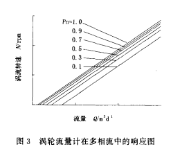 如果用全集流型涡轮流量计测得涡轮转数N,在标准计量装置上通过标定获得Kw和q,结合辅助参数ρn,就可以用公式(3)计算出多相流总量。用(3)式在油井的油、气、水多相流流量测量中得到了实际应用,计算误差在5%以内。