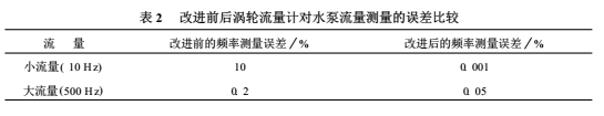采用测频计数——测周计脉冲法与目前测频计数法相比,前者远远小于后者的测量误差,采用这种方法不仅测量精度有保证,且可靠易于实现,可从根本上解决涡轮流量计对水泵流量的测量精度及减小误差问题。表2是改进前后的测量误差实测对比。