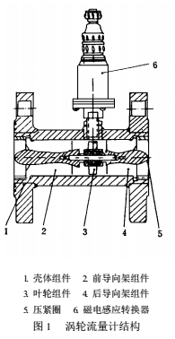智能型涡轮流量计的结构如图1所示。它是一种速度式流量仪表, 以动量矩的守恒原理为基础。当流体冲击叶轮叶片, 使叶轮旋转。旋转速度随流量的变化而变化, 同时导磁性的叶轮周期性的改变磁电系统的磁阻值, 使通过线圈的磁通量发生周期性的变化, 因而在线圈内感应出脉冲电信号, 经放大后计数和显示。