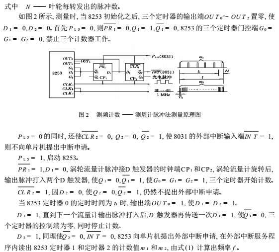 采用这种方法只存在时钟脉冲的计数误差。由于晶振的时钟频率f0很高,在一个信号周期内,±1个字的误差为f/f0,若f0=1MHz,在小流量(f=10Hz)时,相对误差为0.001%;大流量(f=500Hz)时,其相对误差为0.05%。因此,频率测量误差δf相对δw和δ为微小误差,可以忽略其影响。