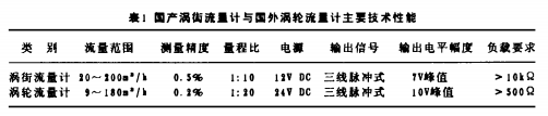 电池供电涡轮流量计与国外涡轮流量计的主要技术性能如表l所示。表1中为采用公称直径为100的传感器测量范围。