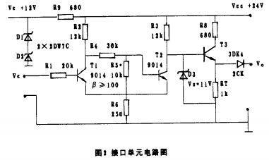 调试时,先将接口单元的输出端接1k电阻,然后将输入端接1.5V电压,逐步减小电阻R5的值,直至输出端电压上升到10V;若不能达到此值,则可能是三*管T3的直流放大倍数过低。逐步降低输入端的电压直至1.2V,此时输出端应为零。若不能可靠地回零,则可能是电阻R5的值过小。