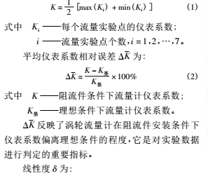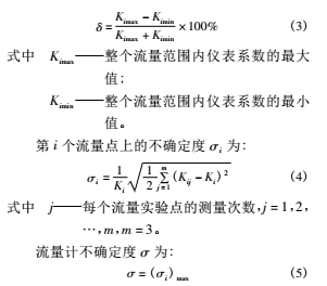 涡轮流量计的原理:当被测流体流过传感器时,在流体作用下,叶轮受力旋转,其转速与管道平均流速成正比,叶轮的转动周期改变磁电转换器的磁阻值,检测线圈中的磁通随之发生周期性变化,产生周期性的感应电势,即电脉冲信号。基于涡轮流量计的测量原理,根据涡轮流量计检定规程,确定了实流实验结果的评价指标,其中包括: 仪表系数、平均仪表系数相对误差、线性度和不确定度。